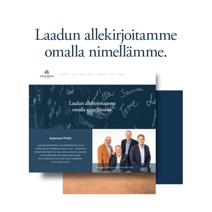 Arjasmaa-konserniin kuuluu useita korjaus- ja uudisrakentamisen ammattilaisia, joiden verkkosivustojen visuaaliset ilmeet, SEO-optimointi, tekninen vaatimusmäärittely ja -ohjaus ovat grundiksen työpöydältä. Sivustojen UX/U-suunnittelu sekä tekninen toteutus on tehty yhteistyössä mainostoimistoKnokin ammattilaisten kanssa.