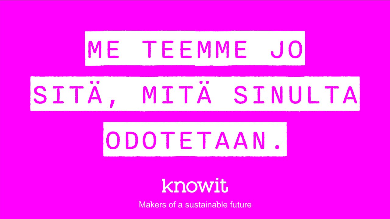 Knowit on ihan mahtava yritys. Saman oven takaa yritykset saavat laaja-alaisesti liikkeenjohdon konsultointia, digitaalisia ratkaisuja ja vaikuttavia asiakaskokemuksia – strategiasta aina toimivaan arkeen asti. Osaamista löytyy, mutta myös sydäntä: kaikkea tekemistä ohjaa visio rakentaa kestävää ja inhimillistä yhteiskuntaa digitalisaation avulla. Ei ihme, että pohjoismainen yritys on kasvanut Suomessa nopeasti 100 asiantuntijan yhteisöstä 500 osaajan monialaiseksi Knowit-perheeksi. Se sitten onkin ihmeellisempää, että niin harva meistä tietää ja tuntee Knowitin. Yrityksen tunnetuus ei ole pysynyt kasvun perässä. Onneksi tämä voidaan muuttaa.