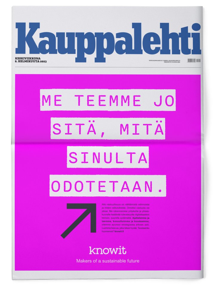 Paine rakentaa tulevaisuus kestävälle kasvulle kohdistuu meihin kaikkiin, mutta erityisesti yrityksiin ja päättävässä roolissa työskenteleviin. Vastuullisuutta odotetaan yrityksiltä kaikilla toiminnan tasoilla. Tekoja tarvitaan. Ja niitähän Knowit nimenomaan jo nyt suunnitelee ja toteuttaa. Siksi kampanjaviestimme "Me teemme jo sitä, mitä sinulta odotetaan" on lupaus jakaa painoa asiakkaiden harteilta ja tuottaa konkreettisia ratkaisuja, jotka tukevat kestävää kehitystä.