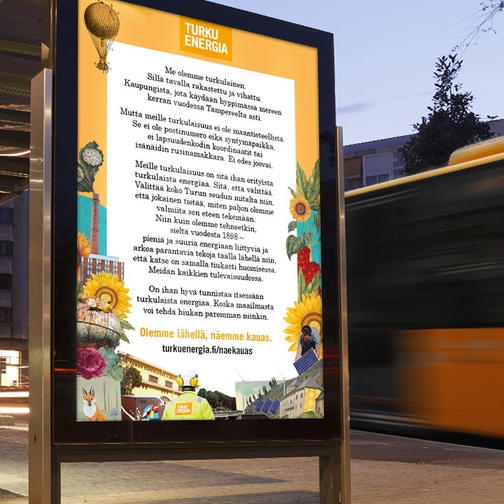Vanha asiakaslupaus Olemme lähellä, näemme kauas oli loistava lähtökohta Turku Energian “2.0”-brändiulostulolle syksyllä 2019. Grundlage suunnitteli ja toteutti brändikirkastuksen ja monimediaisen ulostulon uudella brändillä: näyttiin niin ulkona kuin sisälläkin, netissä, teeveessä ja paperilla ja kuuluttiin radiossa.